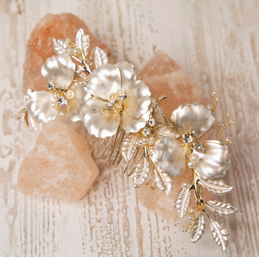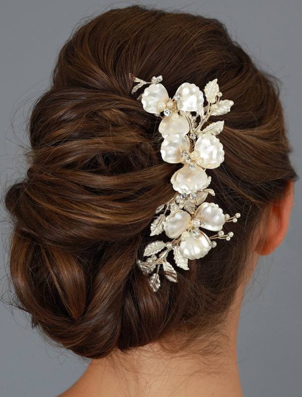 This meticulously hand-crafted wedding comb with freshwater pearl sprays and opal crystals is a must-have luxe headpiece. Hand-enameled with a whisper of light ivory for a subtle matte finish.