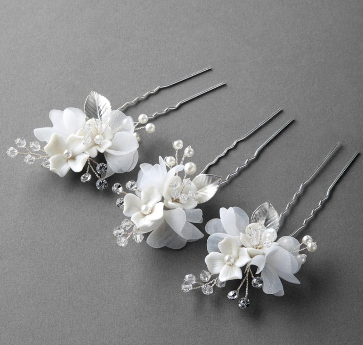 The stunning ivory dimensional flowers and freshwater pearl sprays will compliment any bridal hairstyle. Set of three.
