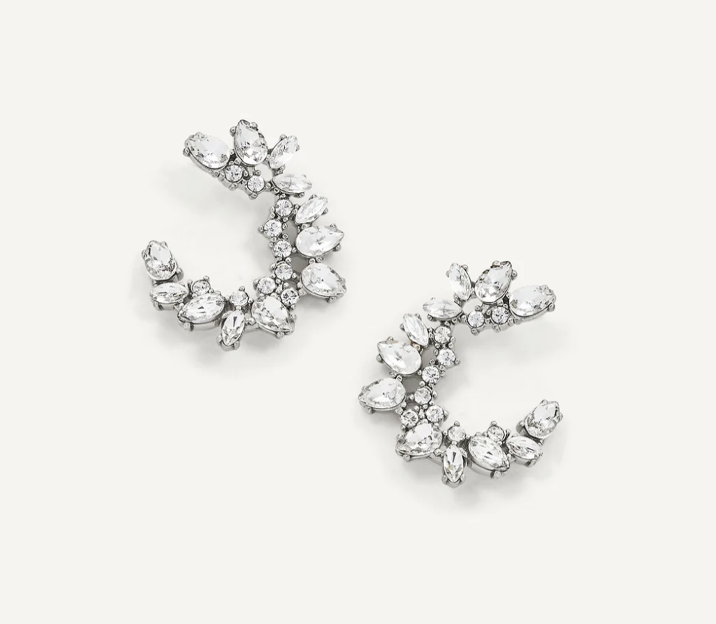 A stunning pair of stud earrings featuring an effortless silhouette with a soft, romantic curve. Covered in twinkling crystals, its unique and effortless design is unforgettable. SILVER IN STOCK, GOLD AVAILABLE TO ORDER.