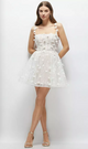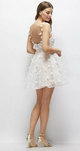 This stunning little white mini dress is perfect for any bride looking for a fun and flirty look. It features a gorgeous floral 3D Trellis Embroidery overlay that adds a romantic, elegant vibe. Underneath, there's a chic nude-hue boned corset-style bodice peeking through, giving it a modern edge. The playful, mini, fully-shirred circle skirt is just right for dancing the night away. And the delicate flower petal details on the spaghetti straps add a whimsical touch. This ultra-chic little white dress is your go-to for looking effortlessly trendy from rehearsal dinner to reception.