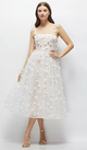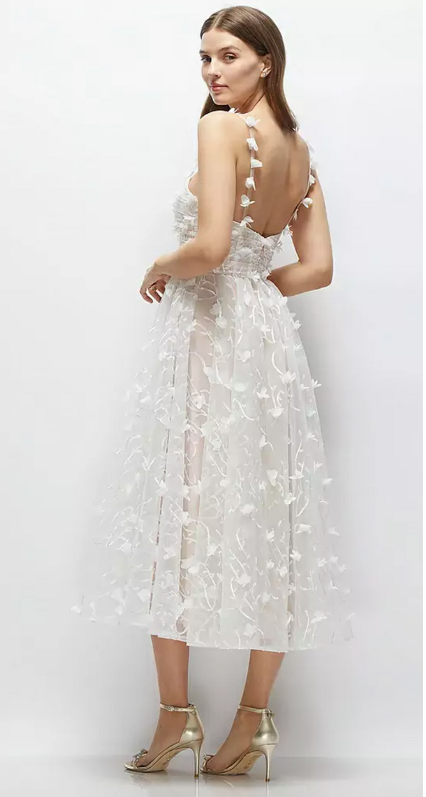 This gorgeous little white midi dress is a total showstopper! It's crafted with a pleated ivory overlay featuring 3D floral embroidery that elegantly drapes over a light nude, boned corset-style bodice. The spaghetti straps are dotted with delicate flower petal details, adding a playful and romantic twist. This LWD isn't just a dress—it's a wearable piece of art. Get ready to captivate in this luxurious little white dress that's as chic as it is visually stunning.