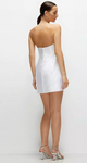 This little white dress redefines bridal chic with its sleek Satin Twill and flirty, custom-made feel. The strapless design shows off those shoulders, while the oversized handmade flower at the neckline—complete with intricate beading—adds that perfect mix of bold and bespoke. The covered buttons running down the back zip bring an extra layer of charm to this already unforgettable strapless mini dress. Whether you're heading to your engagement party or dancing the night away at the after-party, this white mini dress is here to bring a fresh, luxe feel to your next bridal event.