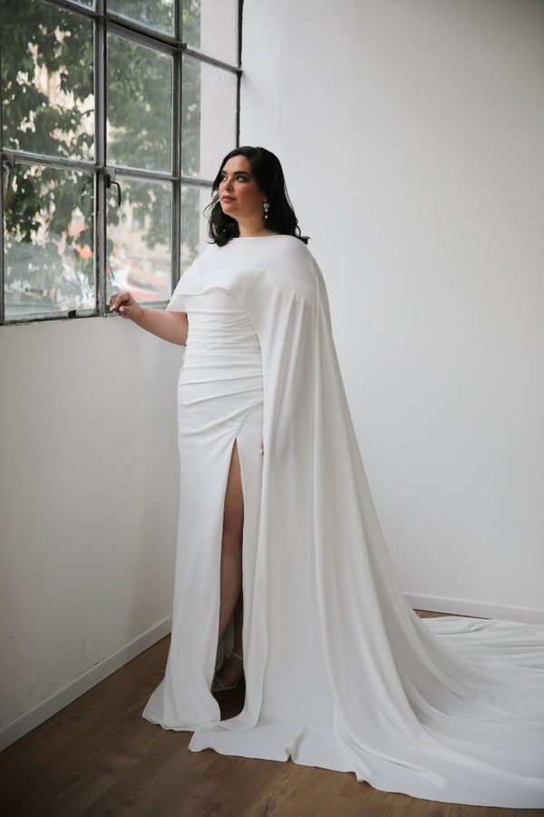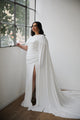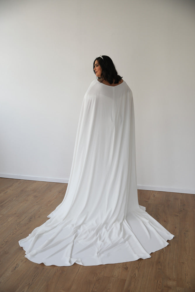 Presenting our opulent wedding cape, fashioned from premium structured yet flowy crepe fabric, embodying a modern regal aesthetic for your bridal attire. This transformative accessory adds effortless sophistication to your ensemble, ideal for the discerning bride desiring a chic statement on her special day.