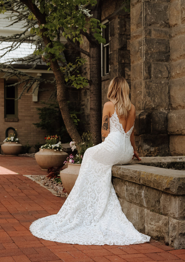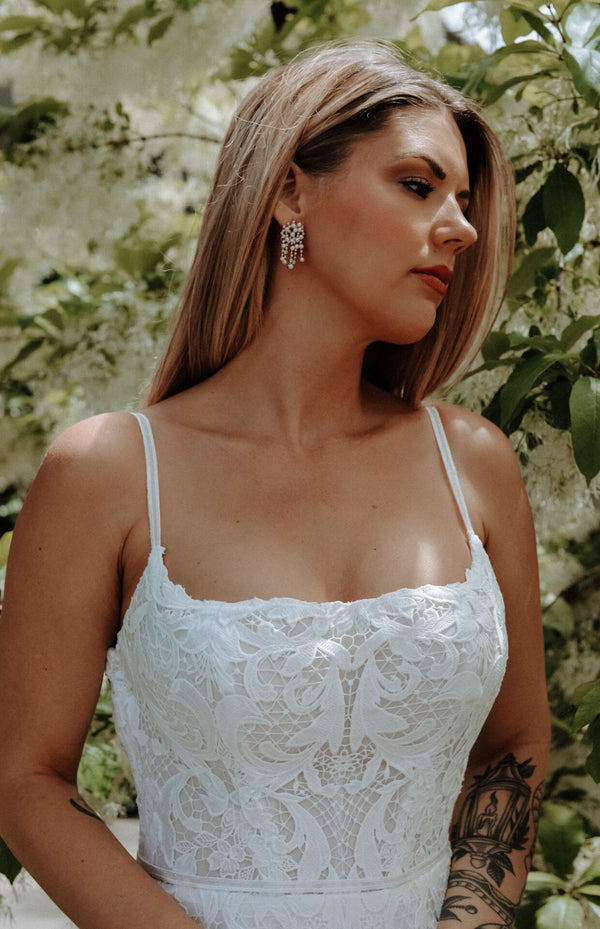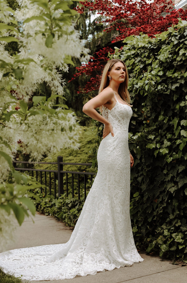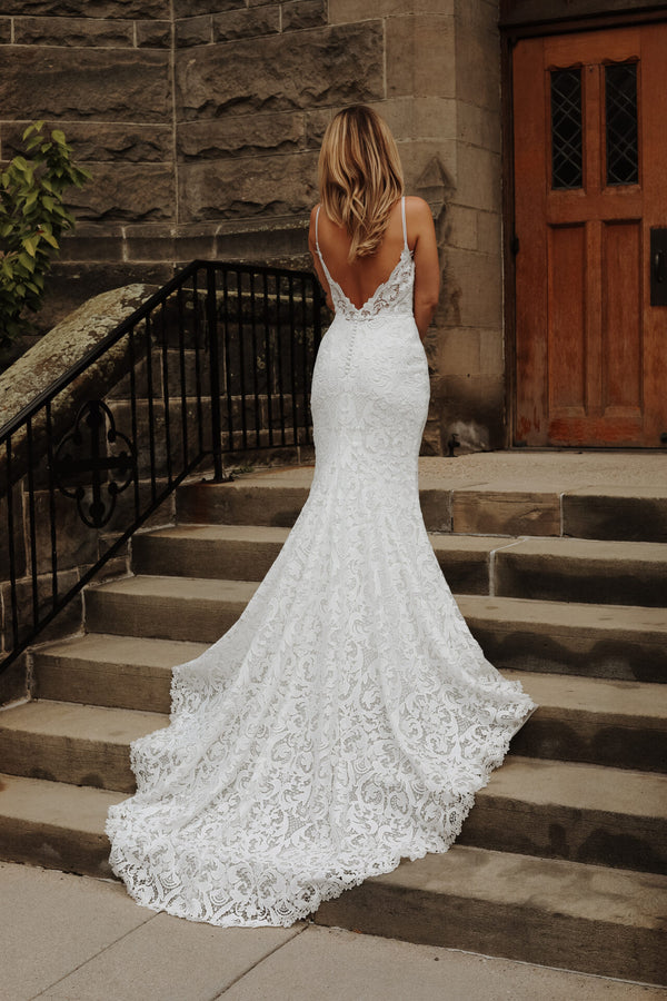 Effortlessly chic and undeniably romantic, the addy gown embodies modern bohemian allure in a captivating lace column silhouette. Delicate spaghetti straps frame a sophisticated square neckline, leading the eye to an allover matte graphic lace that embraces every curve. A breathtaking sheer lace open V-back leads to a small row of fabric-covered buttons for a lacy bridal look that catches the eye from every angle. Complete with a detachable lace belt for versatile styling, this modern boho wedding dress strikes the perfect balance between timeless elegance and free-spirited charm.