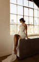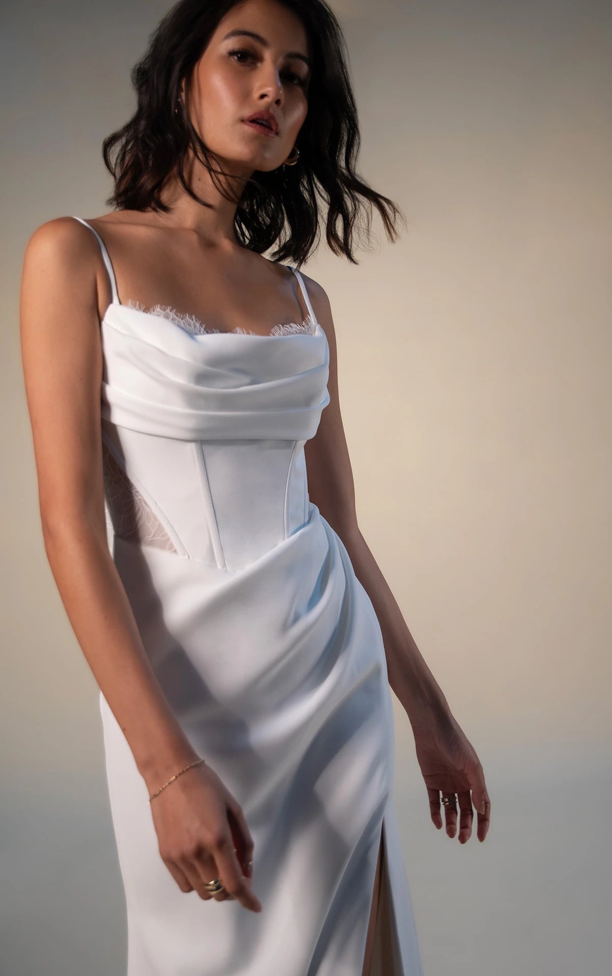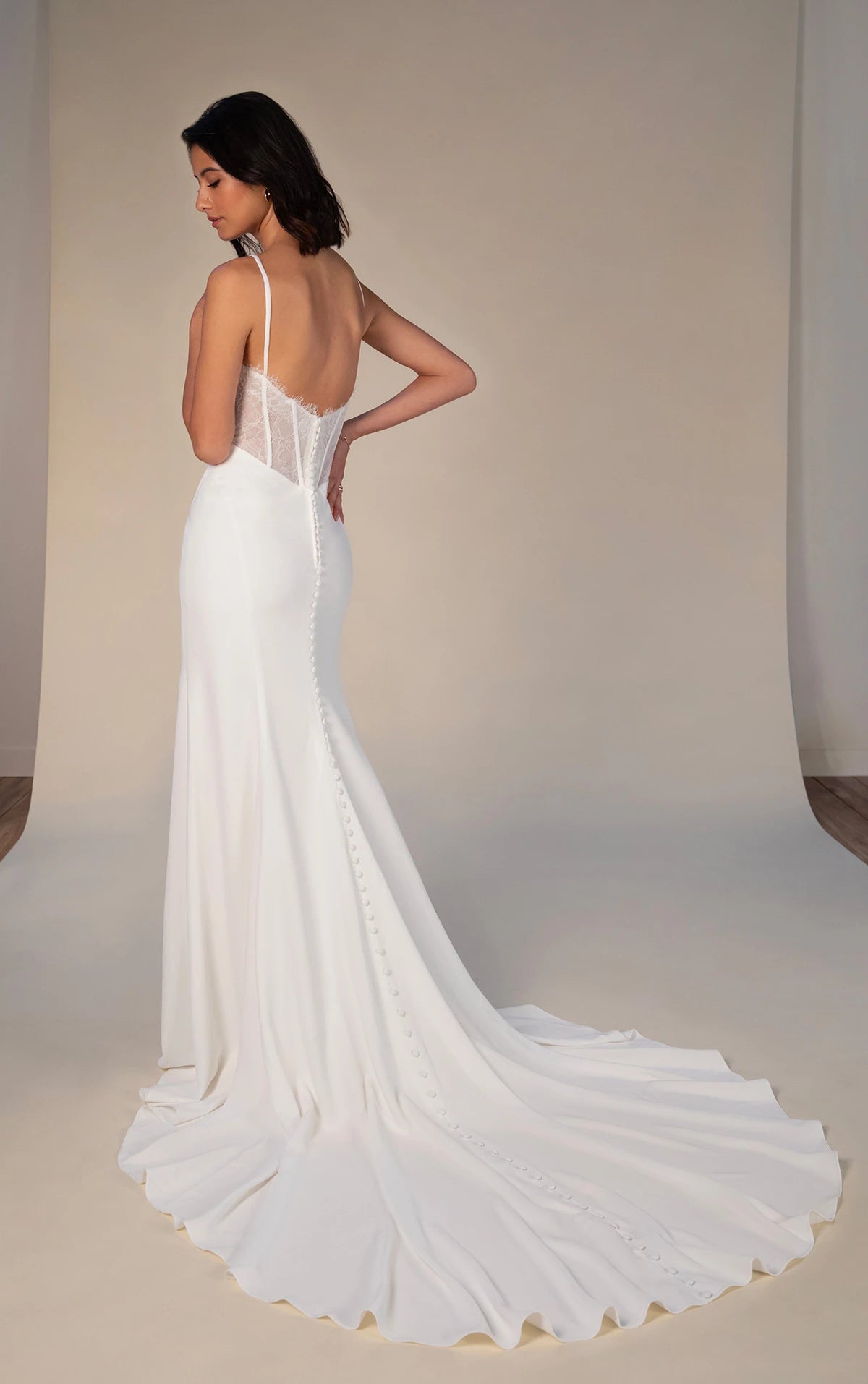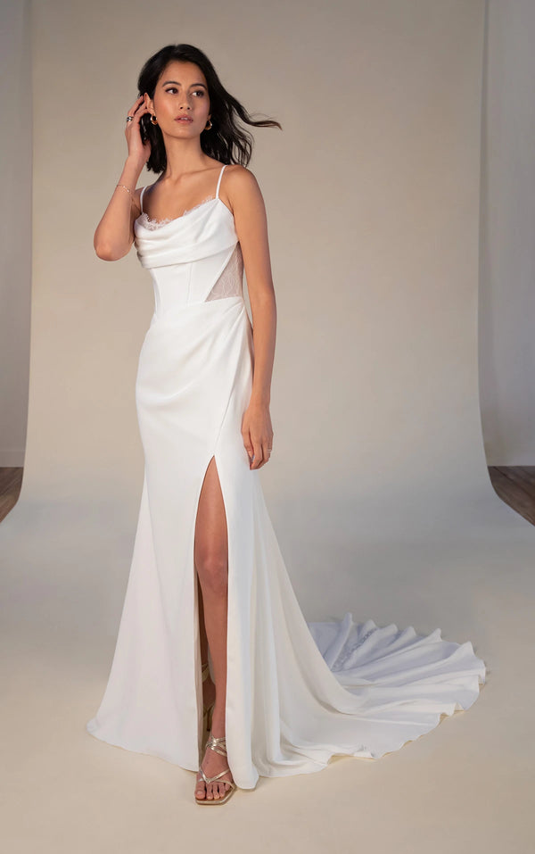 Romantic, sexy and effortlessly chic, this luxe crepe column wedding dress embodies modern bridal sophistication for the adventurous bride. The carson gown features delicate spaghetti straps that lead to a draped scoop neckline, outlined with a touch of eyelash lace for subtle romance. The sculpted bodice, featuring corset boning, creates a stunning hourglass silhouette enhanced by sexy side cutouts that join an all-lace back and a row of fabric-covered buttons for a timeless finish. The draped column sheath skirt gracefully skims the figure, while a leg slit offers a flirty glimpse of skin with each step. With clean lines and intricate details, this sexy spaghetti strap wedding gown was made for the daring and sophisticated bride.