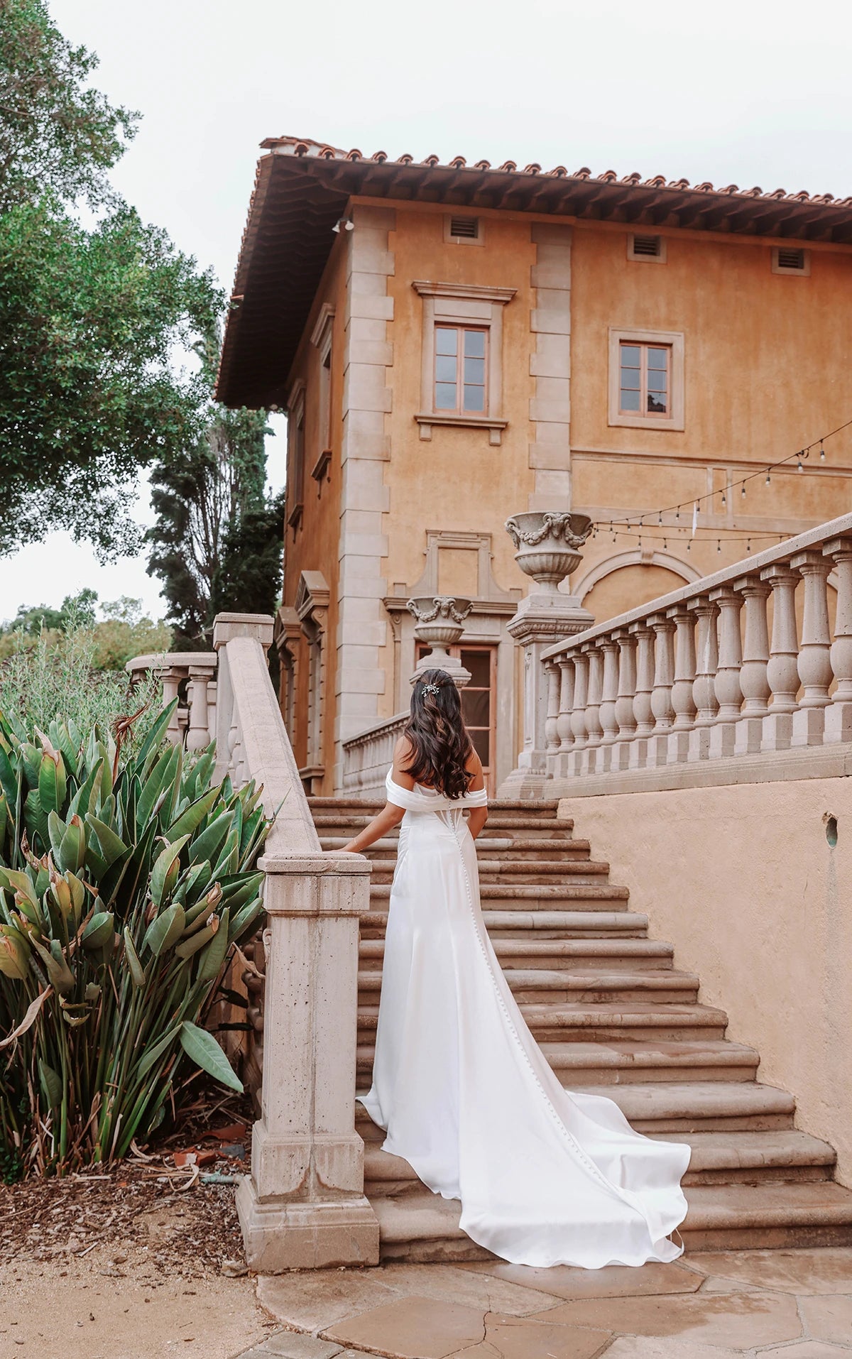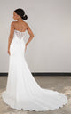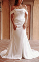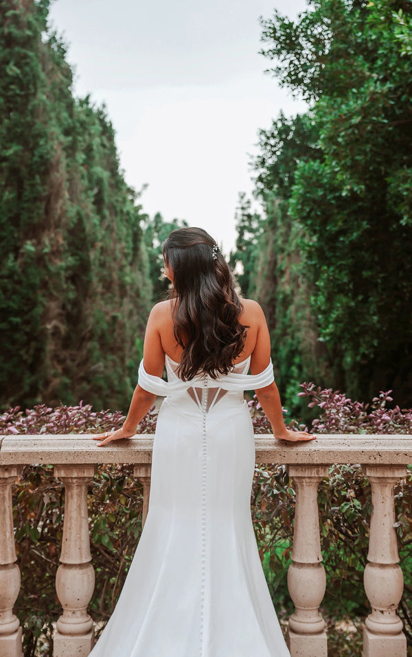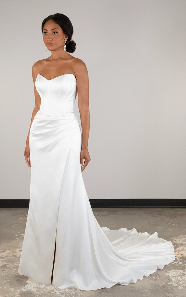 The lustrous Style D4093 offers a modern take on old Hollywood glamour. This modern fit-and-flare wedding gown is as versatile as it is fashion-forward. A detachable off-the-shoulder shawl add a glamorous Bardot neckline over a strapless chic bodice with structured architectural boning to accentuate the hourglass silhouette. A draped waist wraps around the hips, opening at the thigh for a sexy optional leg slit, and effortlessly flowing into a luxe flared skirt. For a clean and chic bridal look with subtle designer details, this glamorous wedding gown has it all.