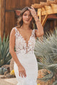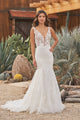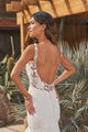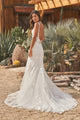 Feel adventurous in this body contouring trumpet bridal dress. The sheer bodice offers a sexy plunging V-neckline paired with a stunning scoop back. The gown features a sparkly dotted glitter tulle that acts as the perfect underlay for the matte cotton lace appliqués. With a chapel length train, glittering tulle buttons accent the back bodice.