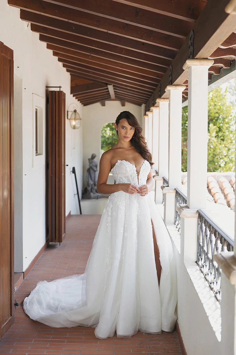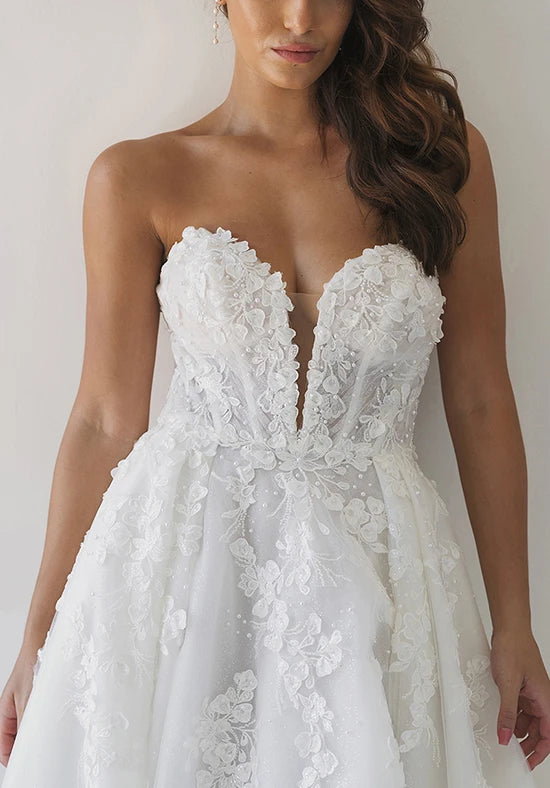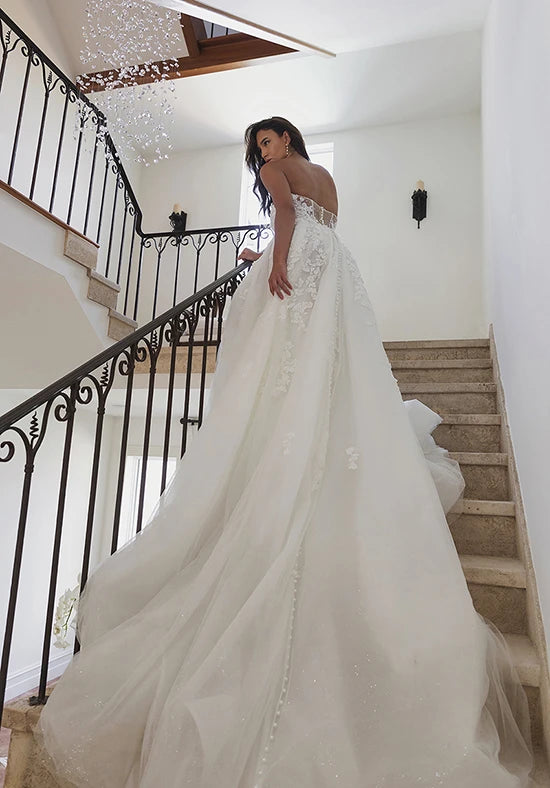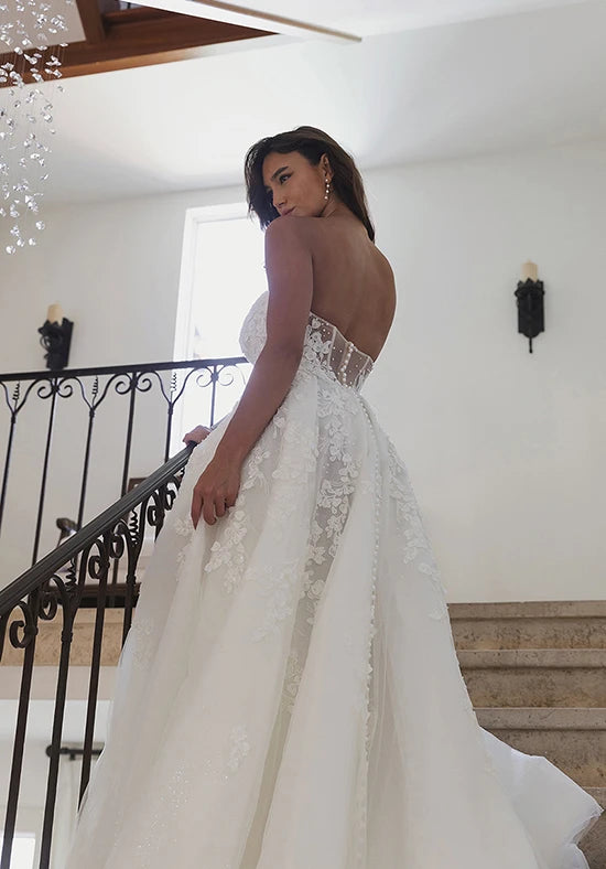 The essence of romance blooms in Style 1715, a floral lace A-line wedding dress with stunning fashion-forward details. A strapless sweetheart neckline plunges over a bodice lavished in 3D floral and pearl-adorned lace appliques. A gorgeous illusion open back detail is framed in lace with timeless fabric-covered buttons that trail to the hem of the train. From the waist, soft pleats open into a full A-line skirt adorned with scattered tendrils of lace appliques. Feel utterly romantic and sophisticated gliding down the aisle in this romantic A-line wedding dress.
