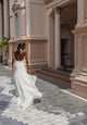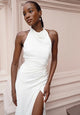 Make a sultry fashion statement down the aisle in this couture column wedding dress. Style 1739 features a high draped halter neckline in Luxe Silk Double Crepe fabric. A softly ruched waistline clings to the figure, highlighting the alluring hourglass shape as a daring low open back detail meets the waistline for a contemporary and sleek bridal look. The glamorous column silhouette clings flawlessly to every curve before giving way to an ultra-high leg slit for a final sexy detail.