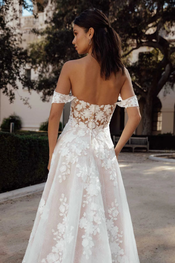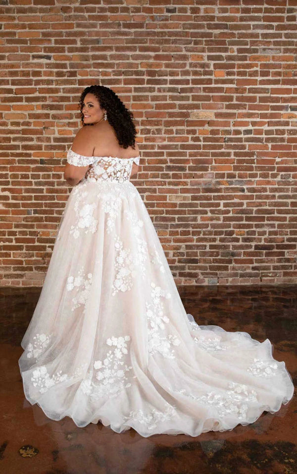 Elegant floral lace embellishes Style D3738 to create a timeless and romantic plus size wedding dress. The strapless sweetheart bodice meets detachable off-the-shoulder straps for a versatile and effortless bridal look, as a sheer lace back adds a discreet sexy detail. From the waist, the lightly textured tulle flares into a soft ballgown skirt, adorned with expertly-placed floral lace appliqués all the way to the edge of its sweeping train.
