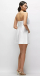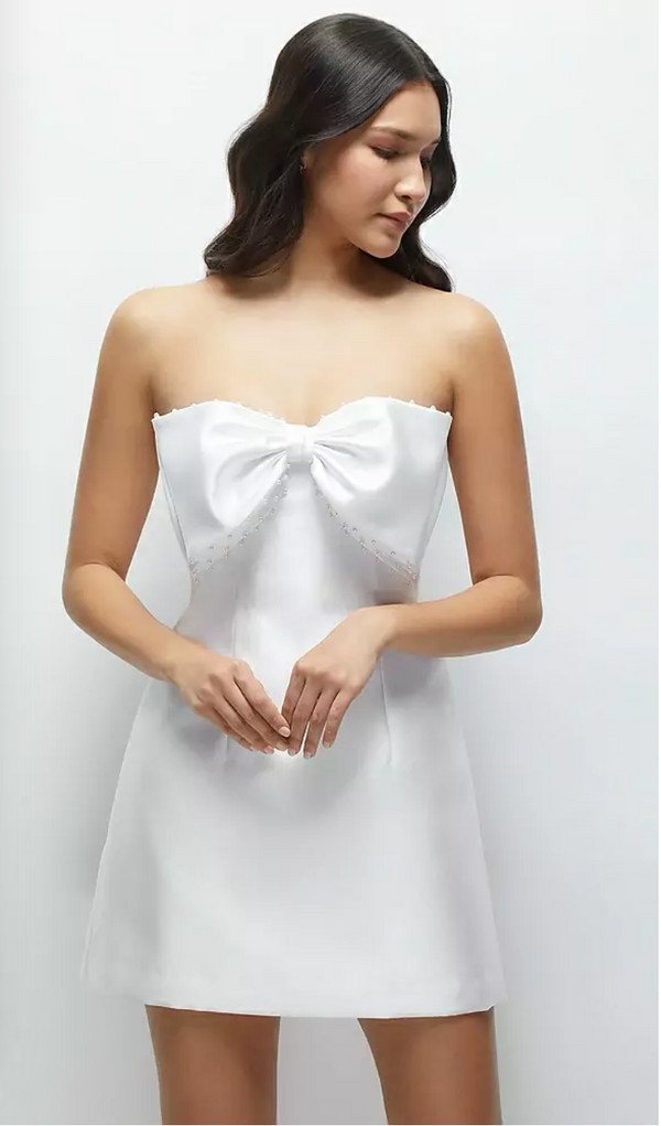 This super cute little white dress epitomizes sleek-meets-chic with a playful twist. Front and center is a handcrafted oversized bow dotted with pearls for a subtle bling factor. The white luxe satin twill fabric glows with a subtle sophistication, serving up a totally stunning strapless mini dress. Lustrous pearl buttons line the back-top closure, and the perfectly flared mini bell skirt is dance-floor-ready.