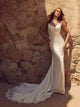 This backless slip style wedding gown is elegant, flattering, and ultra-romantic. You'll be dizzy with compliments on the train - an illusion lace hemline cut in the shape of a dahlia. A last chance to have this as your dream dress as it is now discontinued.