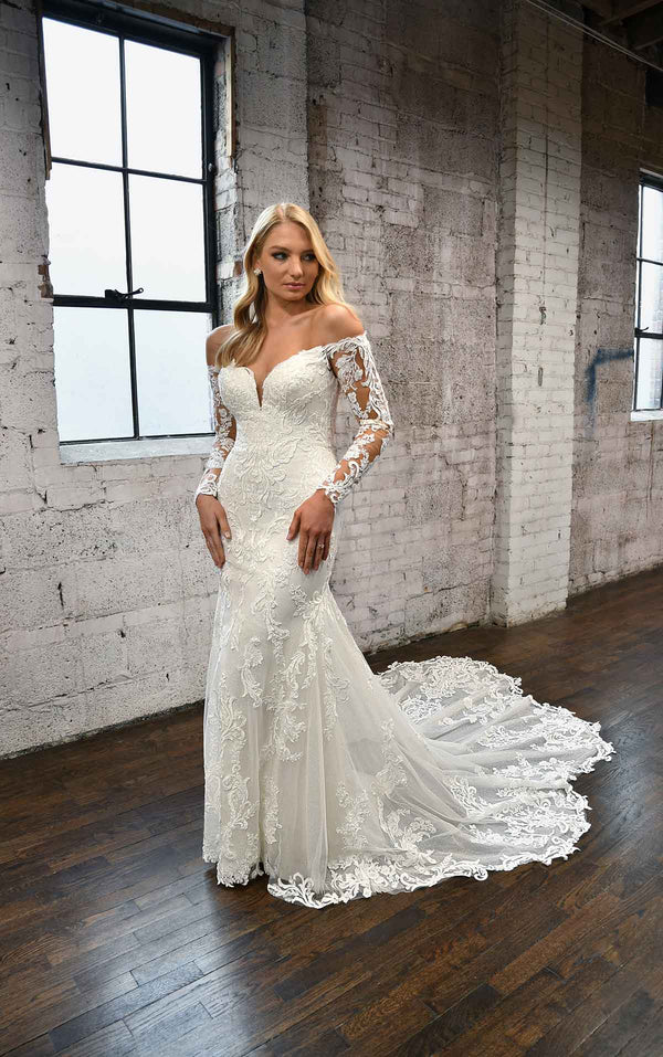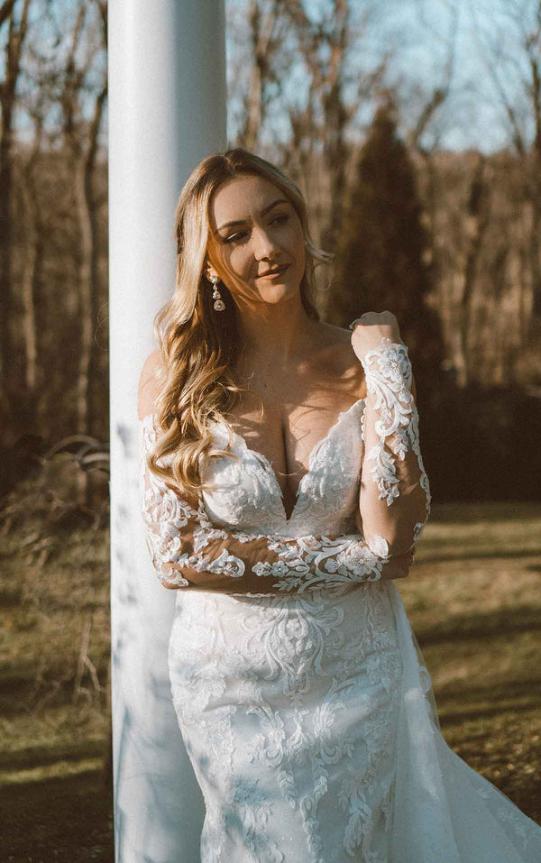 Classic bridal beauty is designed for the high-fashion bride in Style 1359. Extravagant large-scale lace patterns cover this wedding dress, from the top of the neckline to the very bottom of the hem. The swirling lace pattern inspired is so sophisticated and romantic, with illusion tulle sleeves making the lace appear to float over the body. The sheer details at the back add a sweetly sexy touch, showing off the lace details and timeless fabric-covered buttons. For a full bridal flourish, the detachable overskirt brings this gown from glamorous to simply exquisite. The overskirt makes your walk down the aisle a show-stopping moment worthy of your grand love story.