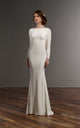 This long sleeve wedding dress from Martina Liana is a statement piece for the modern bride. Sleek, chic and completely unique, this bateau neckline wedding dress with sleeves frames the face effortlessly. From the high neckline, the Bellagio crepe fabric extends into long sleeves, adding a formal touch to the style. Visible seaming through the bodice of the gown helps shape the gown through the body, highlighting your curves before extending into a sheath silhouette. The key featured of this sleeved wedding dress is the cowl back that adds a subtle element of sexiness to this style. Modern, fabric-covered buttons extend from the back of the gown down through the skirt and cathedral train, completing the look of this long sleeve wedding dress.